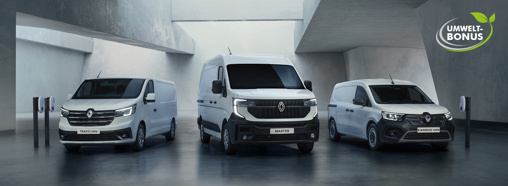 * Der Umweltbonus gilt beim Tausch eines mindestens 8 Jahre alten Nutzfahrzeugs gegen ein neues Renault Nutzfahrzeug. Angebot gültig für Geschäftskunden in der Schweiz bei Vertragsabschluss vor dem 31.12.2025. Dabei muss der Kauf durch den im Fahrzeugausweis des eingetauschten Fahrzeugs eingetragenen Halter erfolgen. Das Fahrzeug, welches gegen ein neues Renault Modell eingetauscht wird, muss seit mindestens 6 Monaten immatrikuliert und noch fahrtüchtig sein.